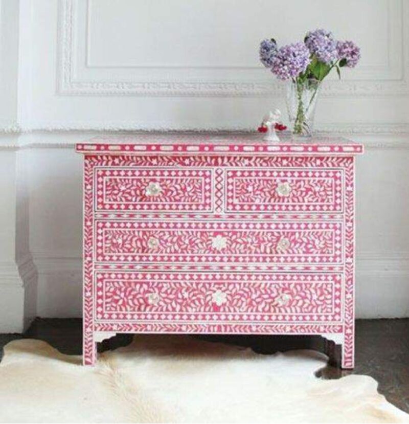 The pink finish adds a playful and feminine touch to the traditional bone inlay design, creating a unique and eye-catching piece. The contrasting colors of the bone inlay and pink background further enhance the visual appeal of the chest.